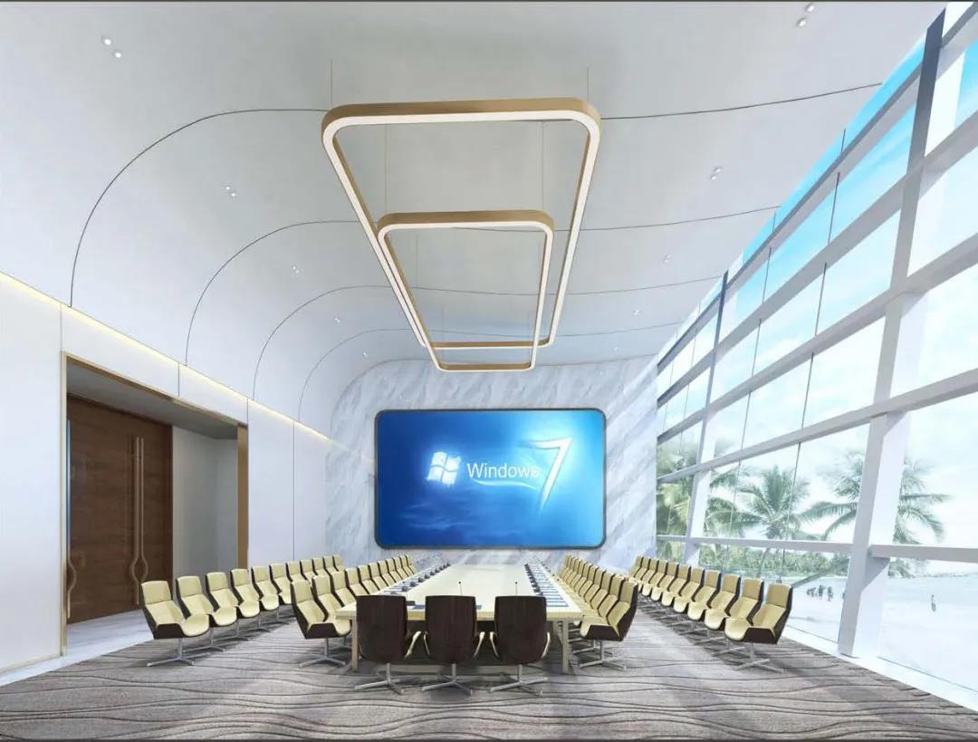 展覽大廳設(shè)計充分利用空間的特征,將兩層巨大的落差變成一個最大特色且和建筑元素相呼應(yīng),以兩翼將高和低空間分成兩個區(qū)域。天花板采用反光膜為空間的主要照明,節(jié)省了空間的能耗,并帶來柔和的主光源。膜天花又像飛翔的翅膀,和建筑飛翔的海鷗形態(tài)相呼應(yīng),墻面、天花嚴(yán)格按聲學(xué)要求設(shè)計。巨型的室內(nèi)空間能有較好的影音效果,整個場景可以滿足高端展示,萬人會議和一些重大活動及演出秀的多重功能。
