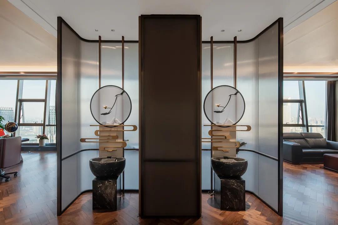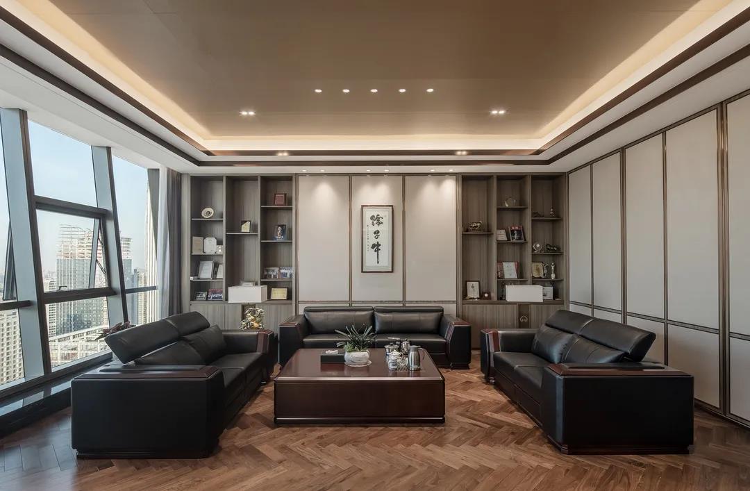 為保證安靜舒適的辦公環境,每個獨立辦公室的內墻面均采用硬包吸音板,地面以褐色條紋地毯鋪貼,莊重又不失美觀。采用皮革、木飾面、雙層紙面石膏板跌級天花吊頂,在視覺上拔高空間,給人以開闊豁然之感,并放置了藝術玻璃屏風和丹青黑大理石洗手臺,大氣而典雅。