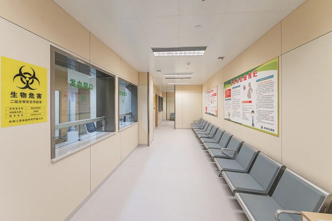 走廊采用HPL醫療板,該材料具有很好的可塑性、絕緣性和耐腐蝕性,具有更長的使用壽命,并且避免涂料、 噴漆、木膠合板墻紙等額外的材料與工序,有效減少甲醛等有害氣體的釋放。在色彩運用上,與大廳的木色色調相統一,讓整個診室走廊更加溫馨。