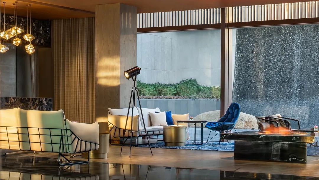 相比冷峻迷幻的大堂空間,YANG為大堂吧賦予了更多的溫情。棕褐木質地面、象牙白暗紋呢沙發、復古暖光的垂吊礦燈……熊熊熾熱的篝火,暈出黃昏的朦朧輪廓。窗外水簾慵懶地哼吟石間,歲月緩緩沉淀,邀你慢下來。