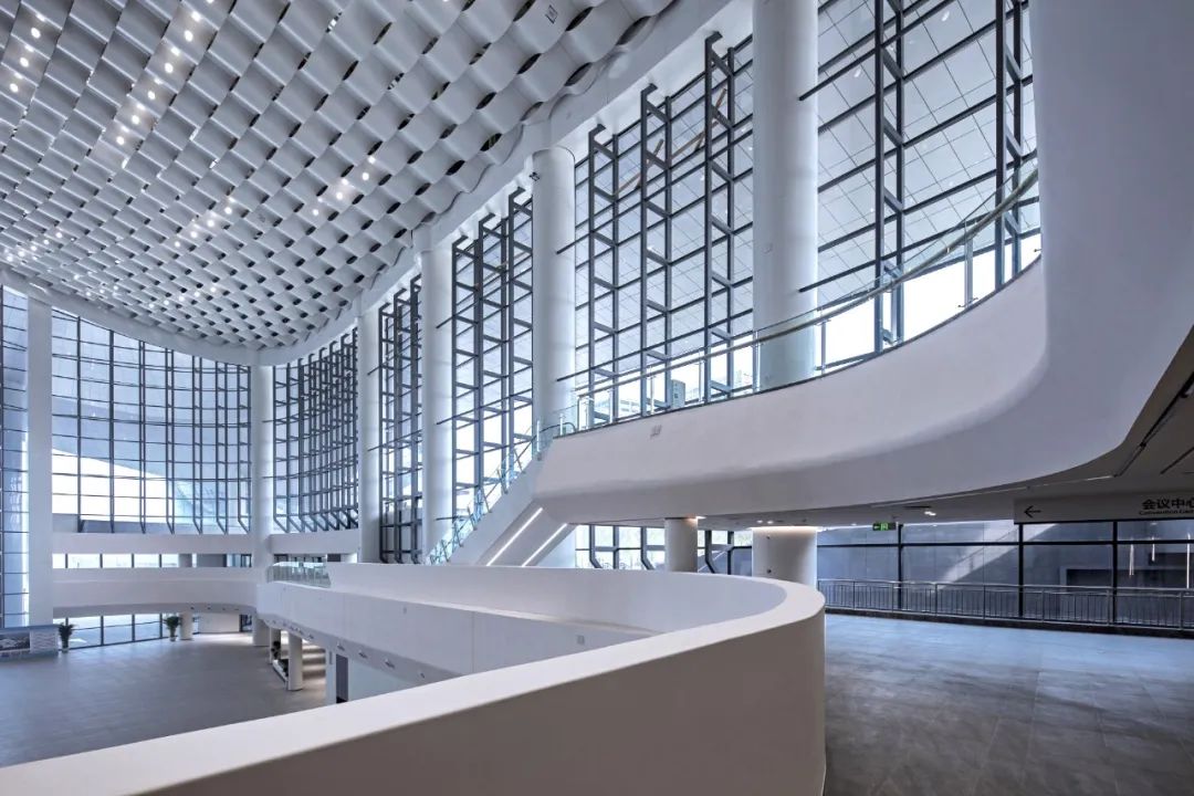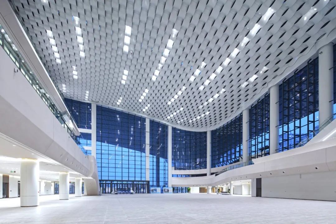 走進門廳,一股簡潔明快、清新大方的現代之風撲面而來。站在高大寬闊的大廳前,人顯得如此渺小。放眼望去,無論是那充滿海浪流動感的四層樓裙,還是那連綿起伏、波瀾涌動的波浪形吊頂,亦或是那鑲嵌在波浪之中宛如明珠般的點點燈光,都讓人有一種身臨浩瀚大海之感。主登錄廳也是整個會展中心最具特色、最核心、最重要的區域之一。