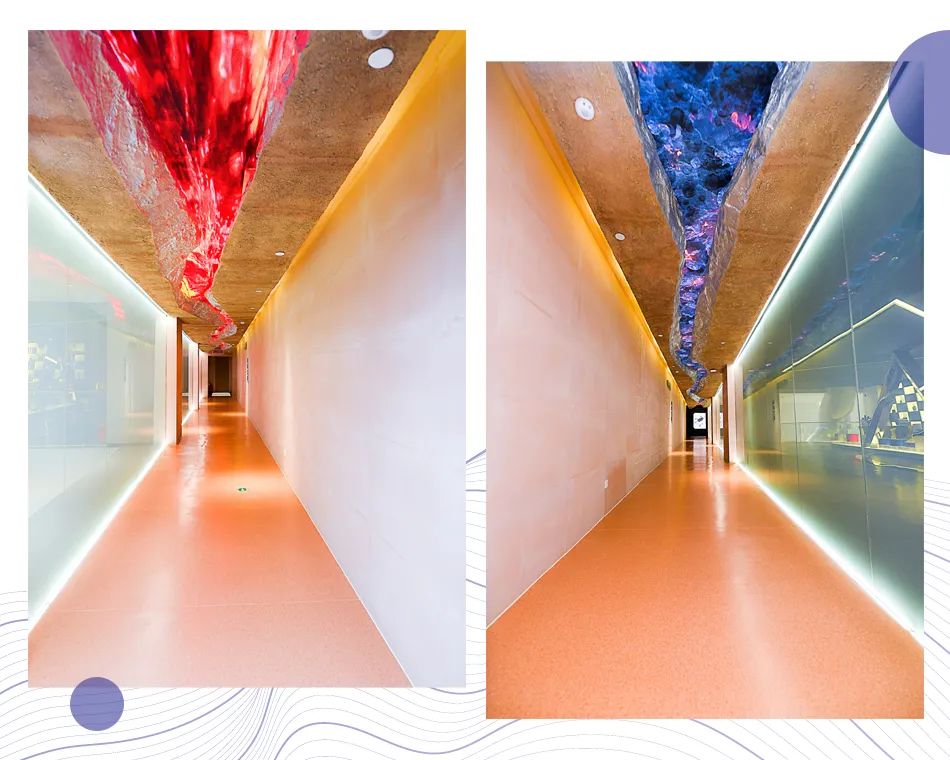 鳳凰之眼背后的陳列柜跟鳳凰的眼睛有光之間的互動,跟隨眼睛屏幕的顏色發(fā)生變化,科技感十足。