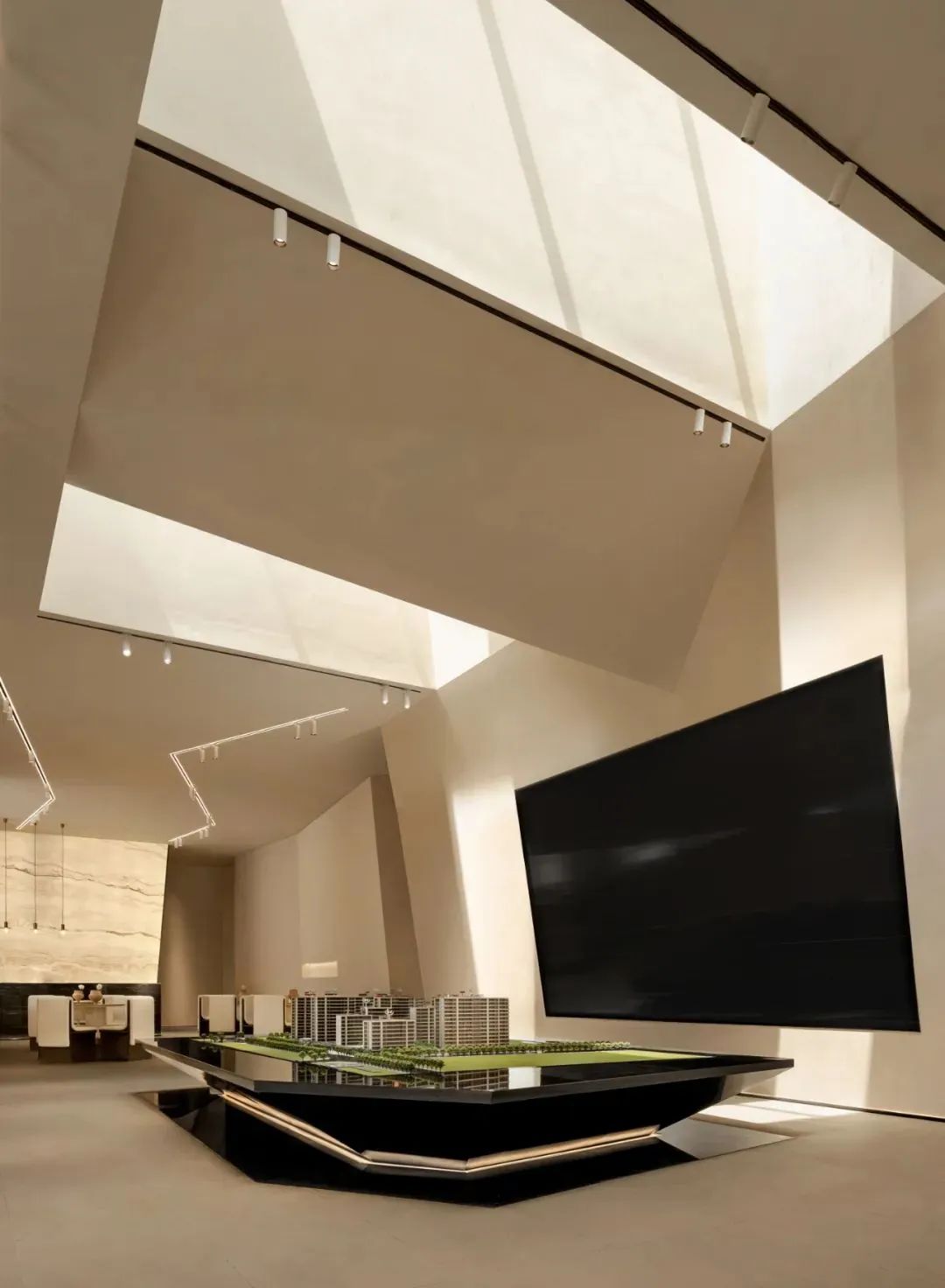 在整個生活館中,人們的體驗在氛圍、光線和質感方面的明顯差異之間取得平衡,從隱匿在山谷頂上的天光到光線充足的臨水洽談區,上升與下降,內部與外部、地面與天空或城市與自然之間的并列,喚起類似山谷游玩的相似感受。
