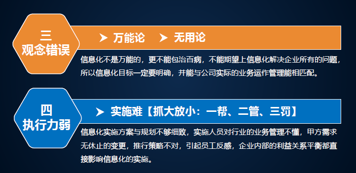 建筑施工企業(yè)信息化產(chǎn)品選型誤區(qū)。很多企業(yè)信息化又想做又害怕,我們總結(jié)了幾方面的問(wèn)題,規(guī)劃錯(cuò)誤,缺少頂層設(shè)計(jì)造成信息孤島。每一個(gè)部門買自己的。我們了解過(guò)一個(gè)企業(yè)有八套系統(tǒng),都是獨(dú)立的,最后作為領(lǐng)導(dǎo)什么數(shù)據(jù)看的都是不一樣的。產(chǎn)品先型不對(duì),越開(kāi)發(fā)越累,要懂行的才能研究出來(lái),如果找一個(gè)軟件,他什么都不懂,能給你研發(fā)出相關(guān)行業(yè)軟件嗎?不行,要選對(duì)。萬(wàn)能論、無(wú)用論,軟件不是萬(wàn)能的,也不是無(wú)用的,關(guān)鍵是怎么用。能實(shí)施好才是最主要的。對(duì)于信息化,不管花幾十萬(wàn)、幾百萬(wàn)、幾千萬(wàn),要落地,否則就打水漂了。信息化是請(qǐng)老師還是請(qǐng)學(xué)生?